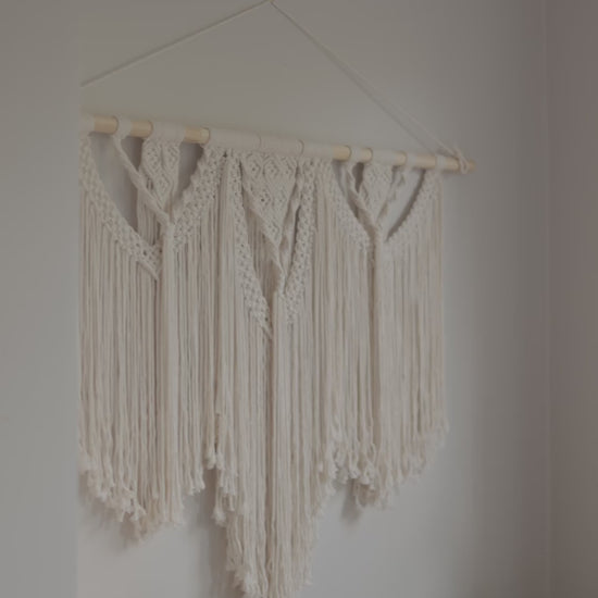 This beautiful handmade macrame wall hanging is made of a combination of natural cotton and a pine stick.