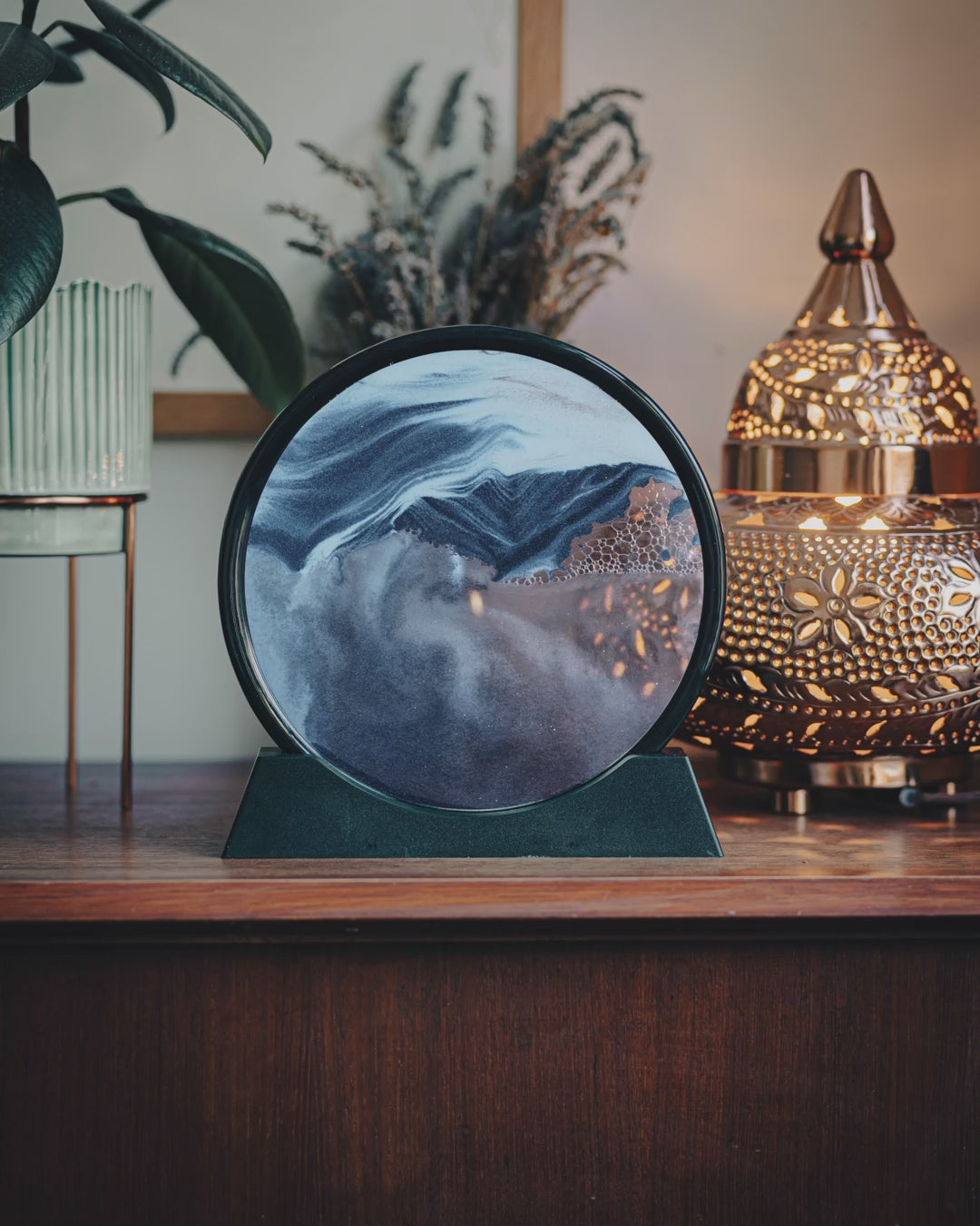 Then stand back and watch the sand stir and undulate slowly forming, ravines, deserts, oceans, and mountainscapes.