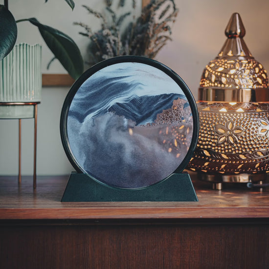 This mesmerising sculpture measures 12" across & comes with a small syringe to either inject air to speed up the sand or remove some air to slow it down.